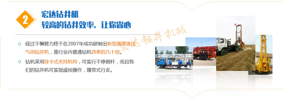 公司始終遵循"客戶第一、團(tuán)隊(duì)精神、長(zhǎng)遠(yuǎn)利益、以人為本"的經(jīng)營(yíng)理念。打井機(jī)公司擁有雄厚的技術(shù)力量。為廣大客戶提供熱情、周到、高標(biāo)準(zhǔn)的服務(wù)。公司擁有完整、科學(xué)的質(zhì)量管理體系。能為客戶提供滿意的服務(wù)是我們公司的榮耀。打造鉆井機(jī)設(shè)備精品、引導(dǎo)技術(shù)潮流是我們永久的追求。